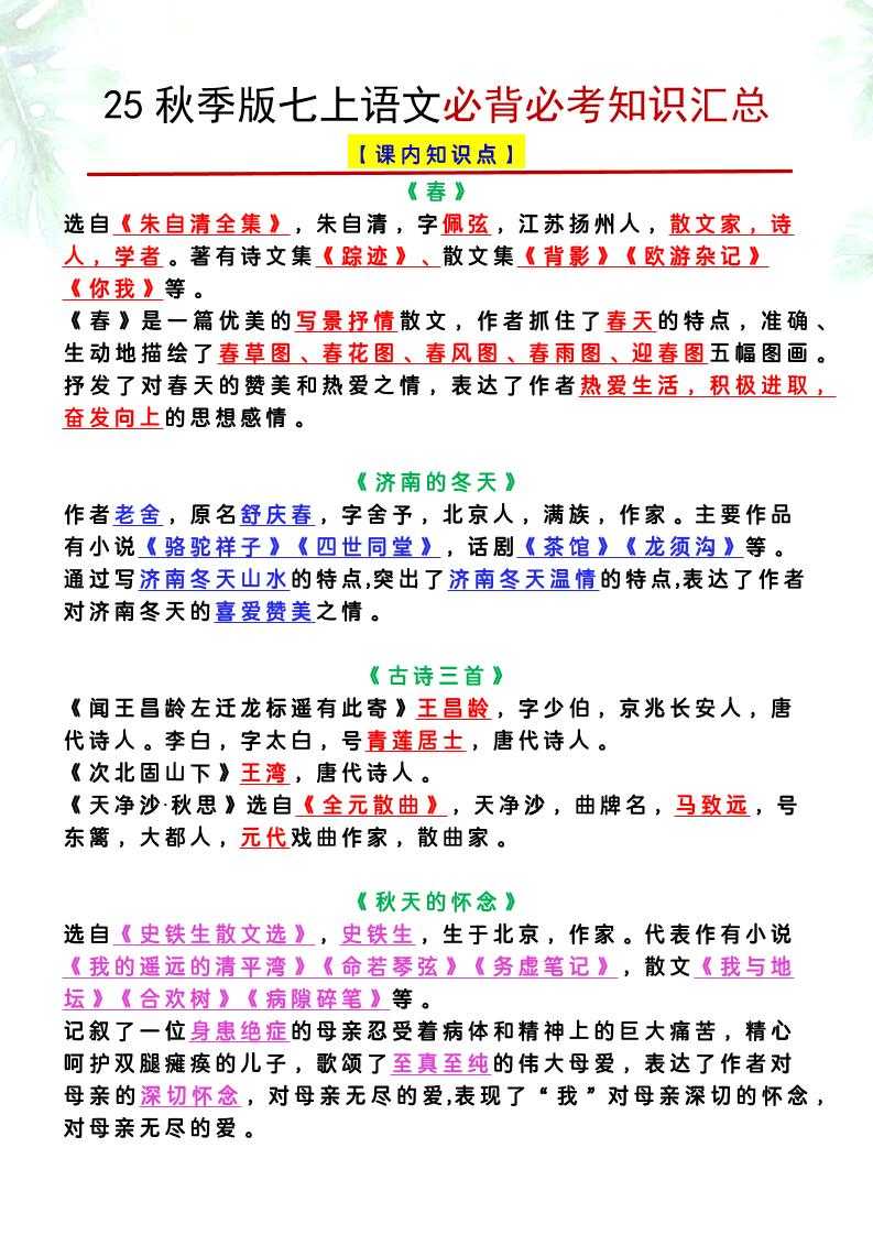 【2025秋新版】七上语文必背必考知识汇总 【2025秋新版】七上语文必背必考知识汇总