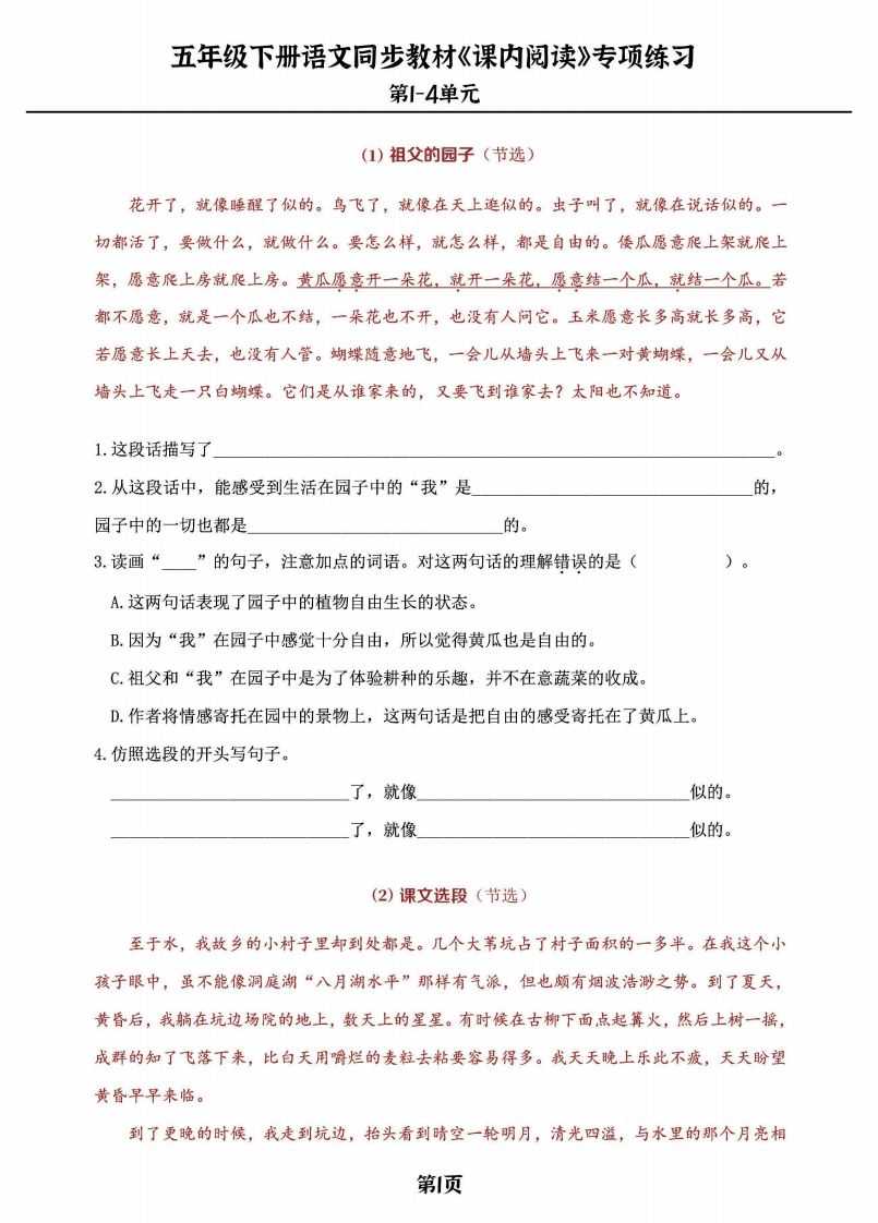 五年级下册语文《课内阅读》专练,同步教材1-4单元 五年级下册语文《课内阅读》专练,同步教材1-4单元