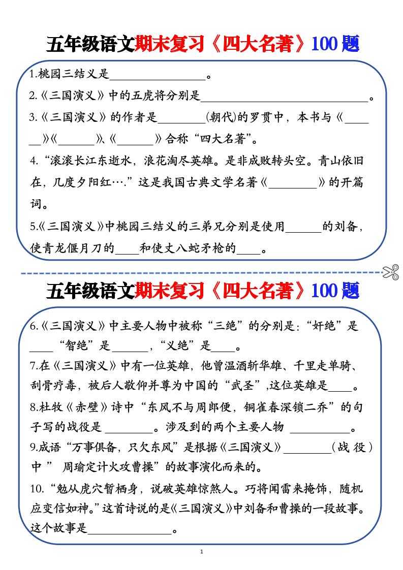 五年级下语文期末复习《四大名著》100题(空白+答案) 五年级下语文期末复习《四大名著》100题(空白+答案)