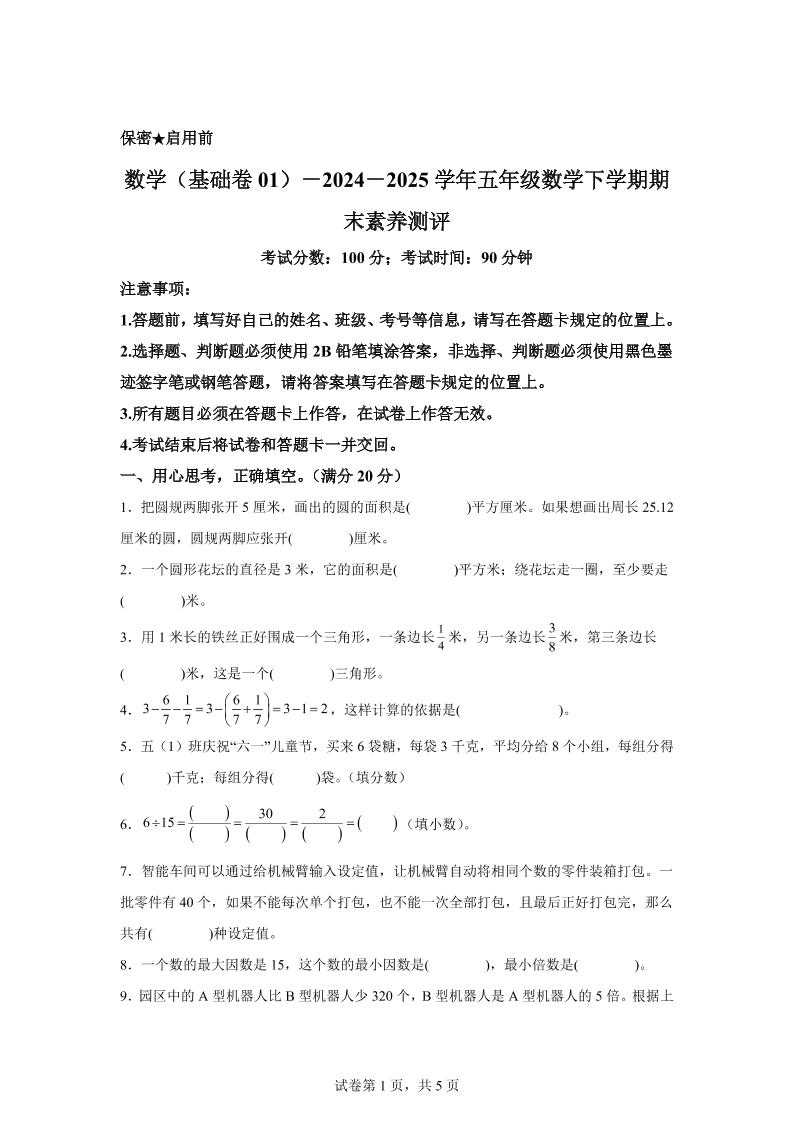 五下苏教版数学【2024-2025学年期末素养测评试卷(基础卷01)】 五下苏教版数学【2024-2025学年期末素养测评试卷(基础卷01)】