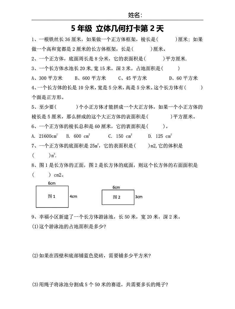 【期末复习每日系列】五年级下册数学立体几何打卡练习每日一练 【期末复习每日系列】五年级下册数学立体几何打卡练习每日一练