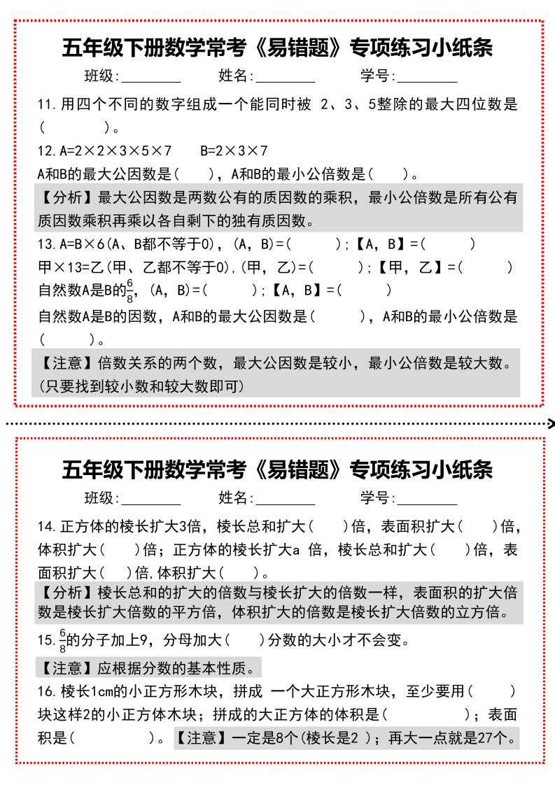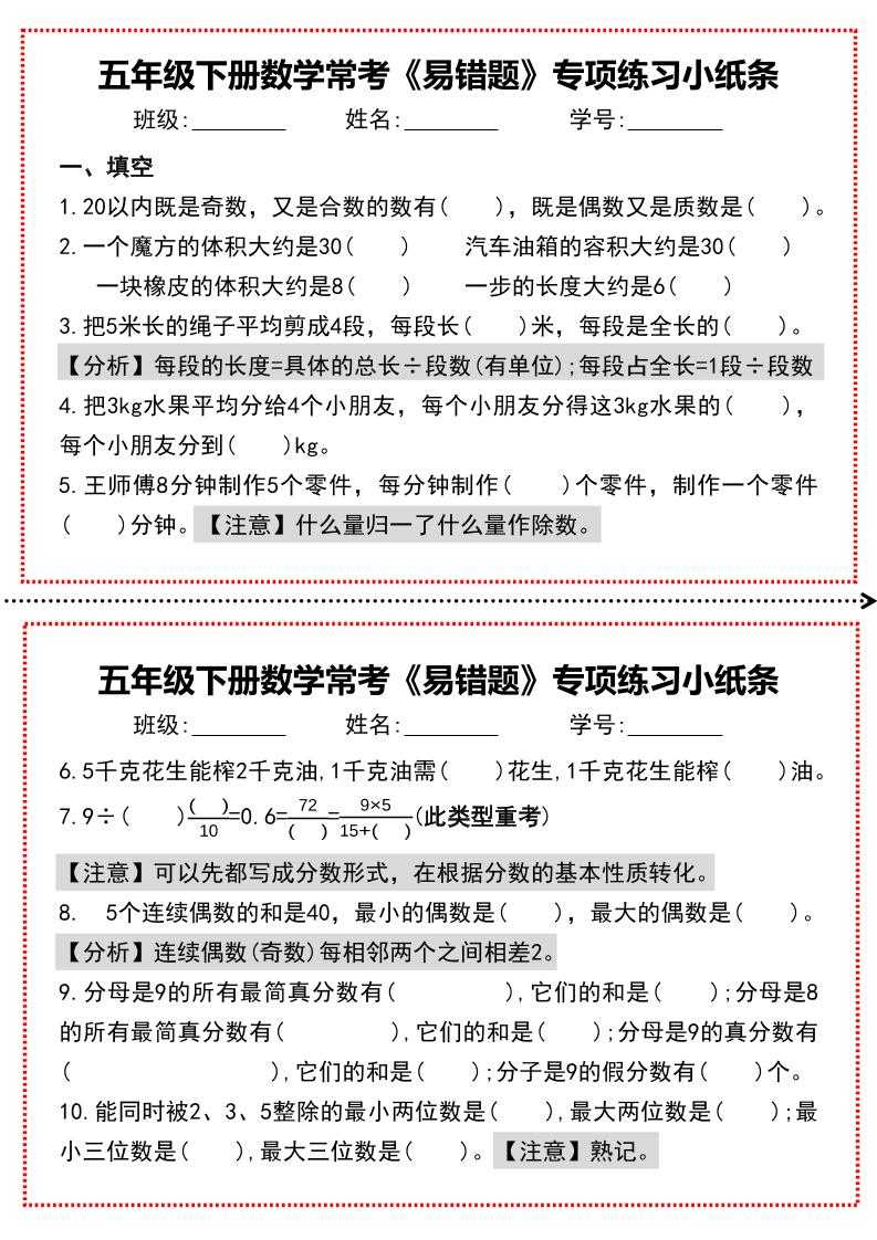 【期末复习每日系列】五年级下册数学常考《易错题》专项练习小纸条 【期末复习每日系列】五年级下册数学常考《易错题》专项练习小纸条