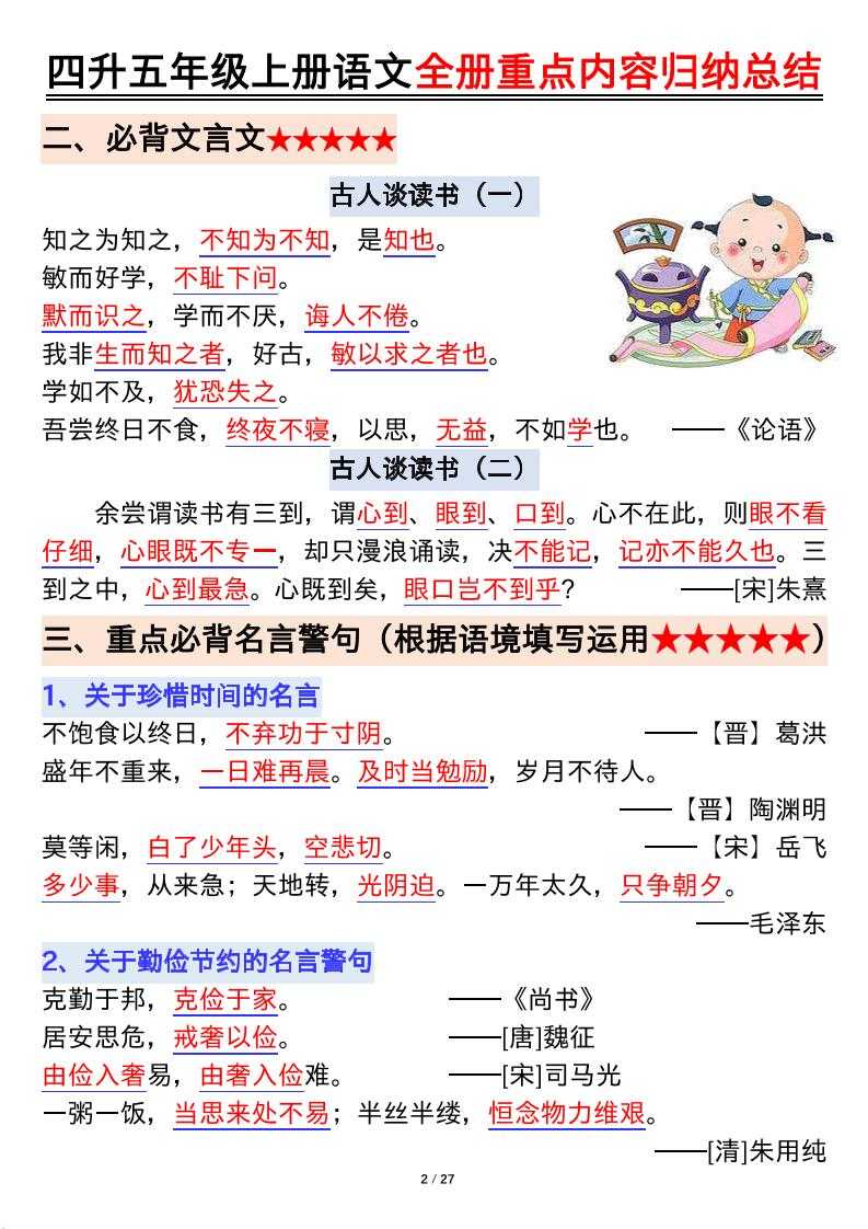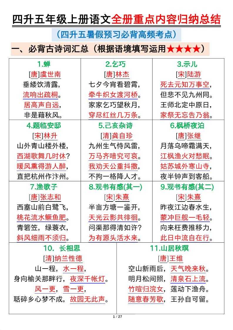 四升五年级上册语文全册重点内容归纳总结输出27页-五上语文 四升五年级上册语文全册重点内容归纳总结输出27页-五上语文